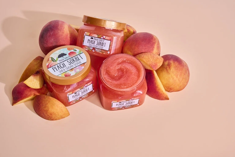 Скраб для тіла Tree Hut Peach Sorbet Sugar Scrub 510g — це персиковий сорбет, який ти вирішила не їсти ложкою, а розмазати по всьому тілу й піти сяяти.