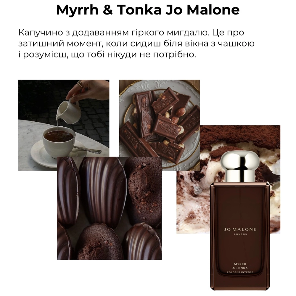 Це — нічна молитва в східному храмі. Jo Malone London Myrrh & Tonka — глибокий, теплодушевний аромат із дорогоцінної мирри, ванілі, бобів тонка та мигдалю. Він залишає густий, солодкуватий слід — як після гарної розмови при свічках.