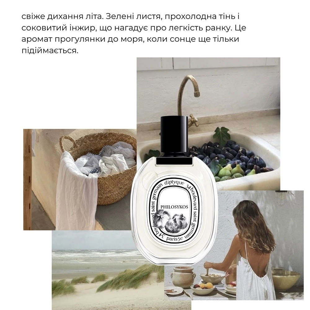Philosykos EDT – це втілення легкості та природної елегантності, ідеальний для весни та літа, для повсякденного використання чи романтичних моментів. Хоча стійкість помірна (4-6 годин), його чистий, універсальний і освіжаючий характер робить його улюбленцем поціновувачів нішевої парфумерії. Відчуйте подих грецького саду з Philosykos від Diptyque!