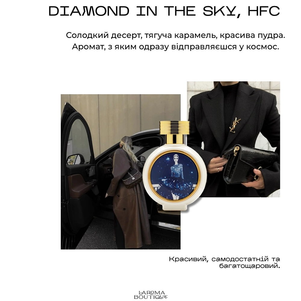 Diamond in the Sky by HFC — це аромат, мов зоряна доріжка на чорному небі: солодкий, глибокий і сліпучий. Верхні ноти карамелі, шафрану та лісових ягід — це спалах світла, як коштовна іскорка у темряві, спокуслива й трохи загадкова. У серці — кашемірове і світле дерево — ніжна, оксамитова тепла текстура, мов блиск діаманта на шкірі. База з ванілі, бальзаму толу, амбри та моху дарує шлейф густий і вишуканий — як нічний аромат багатства, що тане повільно й довго.