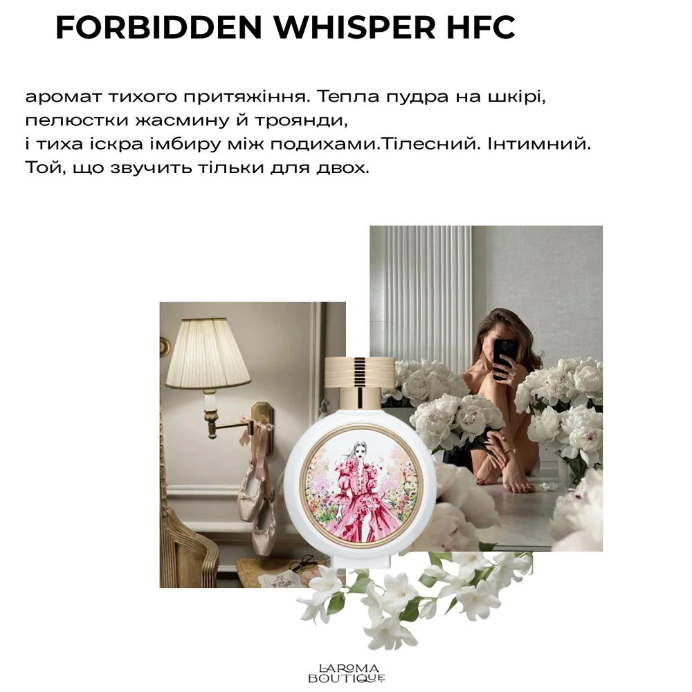 Forbidden Whisper Haute Fragrance Compan — аромат тихого притяжіння. Тепла пудра на шкірі, пелюстки жасмину й троянди, і тиха іскра імбиру між подихами. Тілесний. Інтимний. Той, що звучить тільки для двох.