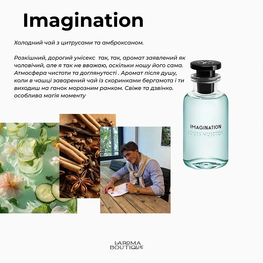 Louis Vuitton Imagination — це аромат для тих, хто цінує елегантну простоту, творчий підхід до життя та бажає підкреслити свій унікальний стиль. Ідеальний як для денного носіння, так і для вечора — завжди доречний, завжди надихаючий.
