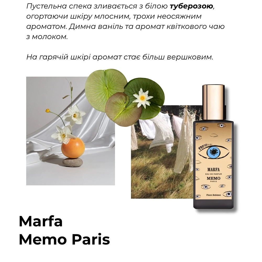 Marfa Memo Paris — це аромат, що відкриває двері у сюрреалістичну пустелю Техасу, де палаюче сонце обіймає квіти, а небо світиться ванільним сяйвом. Це парфум-видіння, де тубероза — не м’яка, а гіпнотична, зухвала, майже психоделічна.