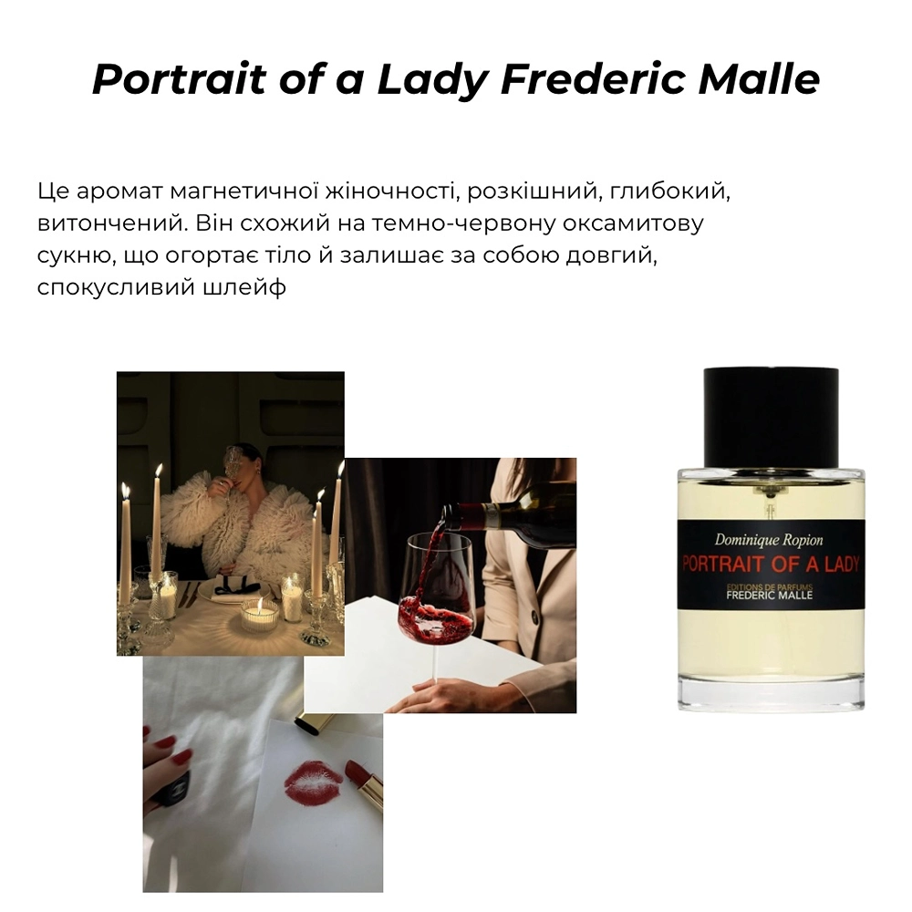Portrait of a Lady Frederic Malle – цей аромат не просто “портрет дами”, це барельєф з ароматів, створений парфумером Домініком Ропьйоном як гімн жіночій силі, загадковості та непідкупній елегантності.