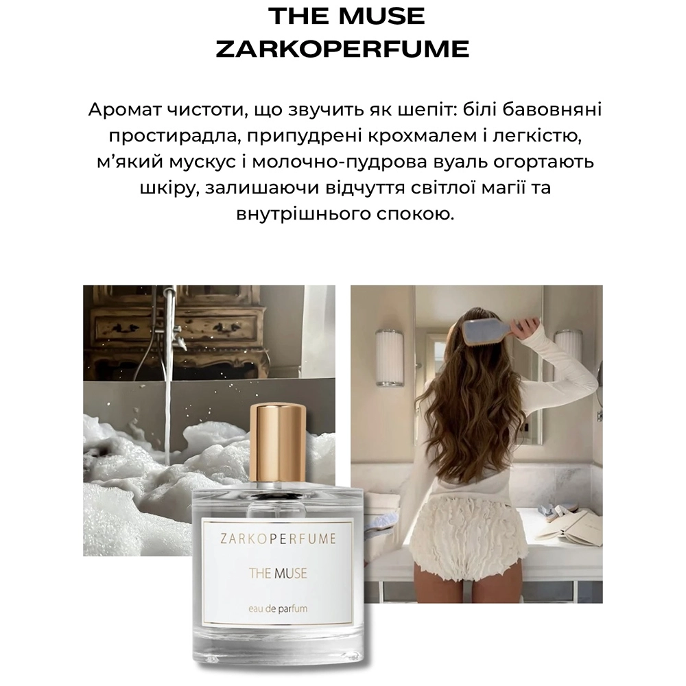 Уяви білу сорочку, висушену на сонці, що пахне чистотою та спокоєм. The Muse Zarkoperfume – це чистий аромат бавовни з легким тепленьким шлейфом від мускусу й удового дерева. Мінімалістично, але глибоко ніжно.